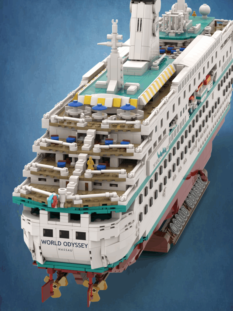 But Alex didn’t stop there. Soon into his SAS voyage, he became inspired to also make a model of the MV World Odyssey – his “home for four months.” While on the ship, (and collaborating with LEGO on the Italian Riviera set, taking classes, and traveling the globe!), he used a CAD program to start the initial design. And he started on some of the intricate details, including the MV World Odyssey’s distinctive stacks, pool, and top decks. From there, the project became a true engineering sprint for Alex, from the ship back to college in California, with nearly five months of design, one month of building instructions, around three months to source parts, and then the final couple of weeks to create the final build.