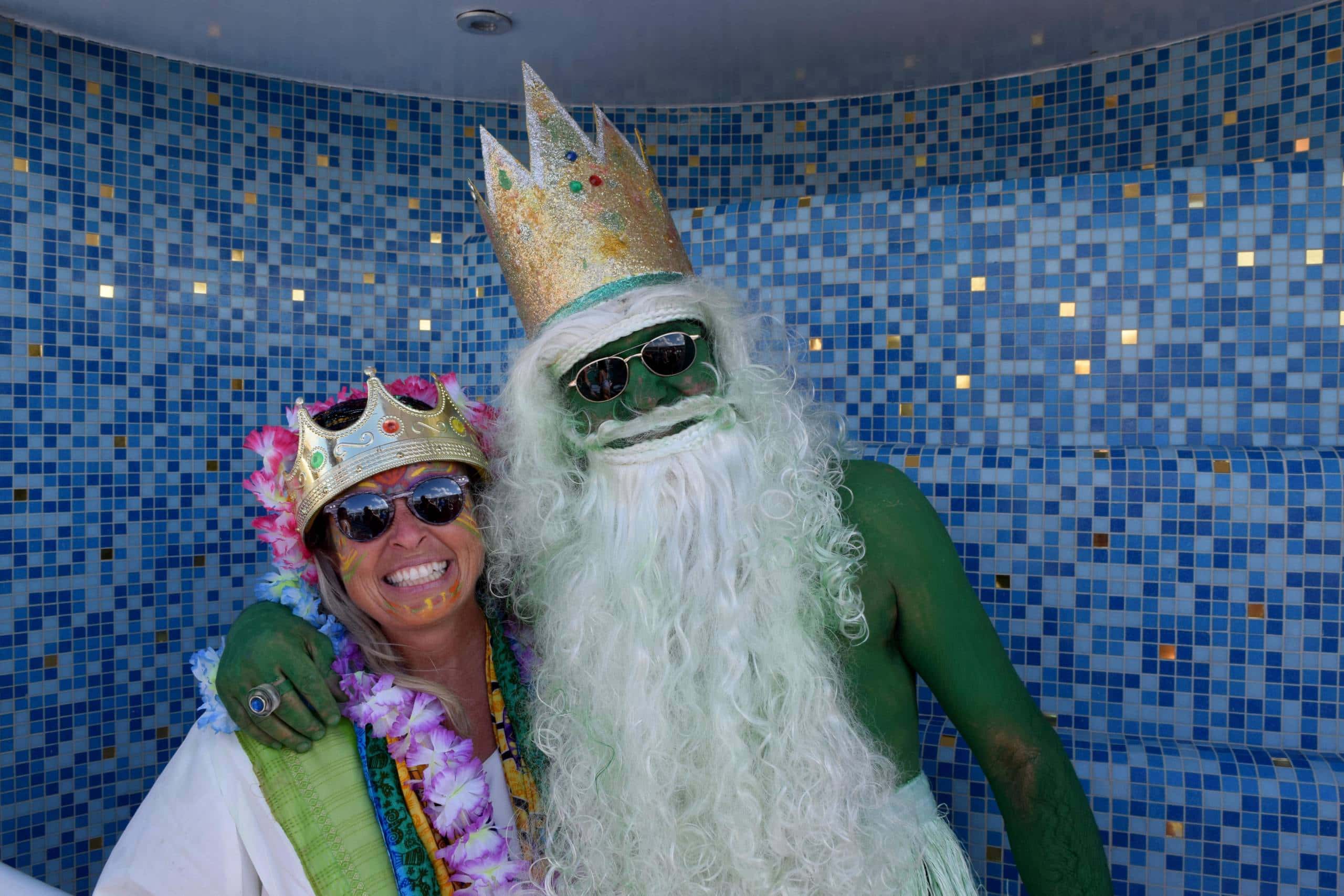 Crewmembers dumped green “fish guts” on voyagers’ heads before they jumped into the ship’s pool. Upon exiting the pool, they greeted a fish in recognition of all the sea life below and then bowed to King Neptune and Minerva, completing their shellback initiation.