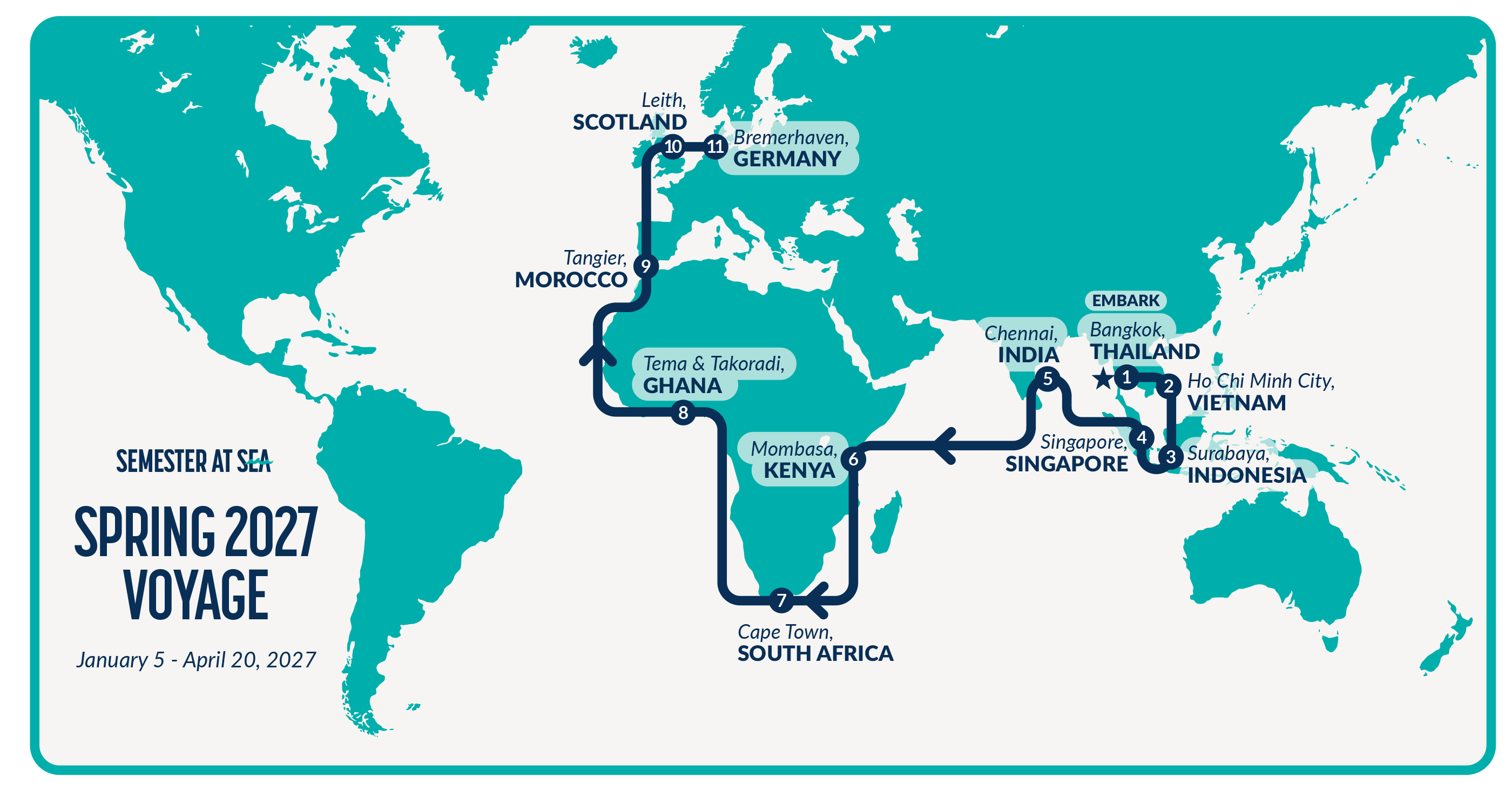 Exploring countries in Asia, Africa, and Europe, this voyage takes participants gives participants a truly global study abroad experience on our floating campus!